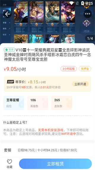 2、请打开主页或租帐号页,在如图所示的筛选栏中选择“租赁”,再根据你对帐号的要求选择其他筛选条件,在筛选栏的下方则显示对应的筛选结果。点击可打开详细信息页查看商品的详细信息。找到您中意的帐号后,您可在商品展示栏该条帐号商品信息的后方选择“立即租赁/预约”,或在商品详细信息页选择“立即租赁/预约”。