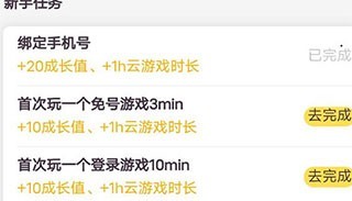 2、新手任务:完成里面的新手任务也可以获得时间增加,通过绑定手机号以及试玩云游戏的方式可以在里面增加相应的时间;