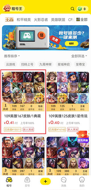 1、打开app,在租号界面中选择你要租号的游戏