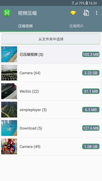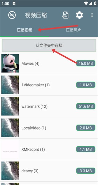 2、在文件夹选择页面,找到并点击包含目标视频的文件夹,进入该文件夹后,选择要进行压缩的视频。