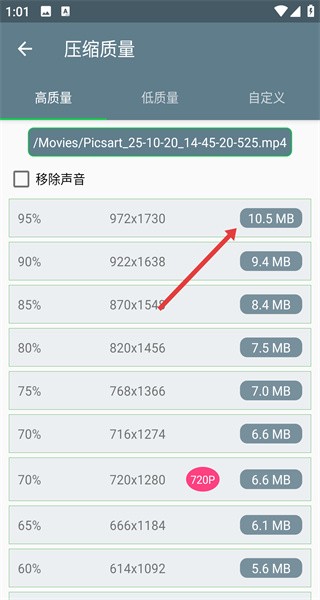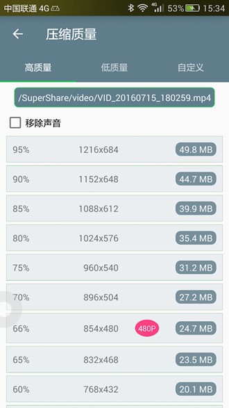 4、在压缩质量设置页面,根据需求选择对应的压缩质量选项,之后等待视频压缩完成,可对压缩后的视频进行分享或删除等操作。
