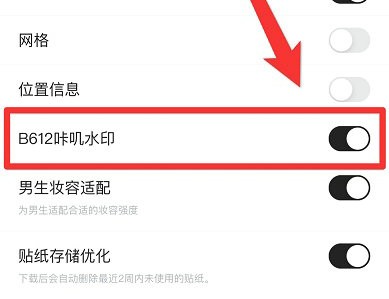 3、在页面中找到“B612咔叽水印”可以看到右边的按钮是黑色的打开状态