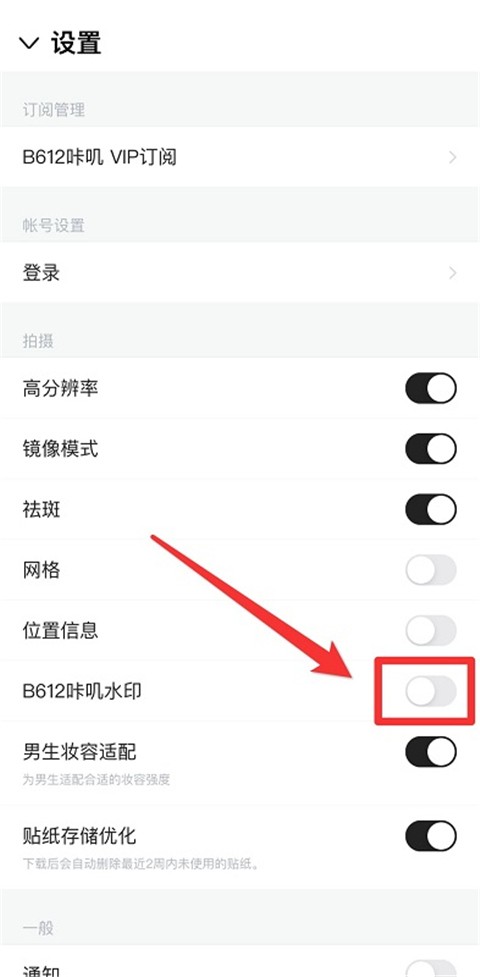 3、在页面中找到“B612咔叽水印”可以看到右边的按钮是黑色的打开状态