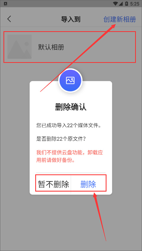 4、照片选择完成后,我们还要点击需要导入照片的相册分类,也可以创建新相册导入,导入完成后您就可以删除系统中的原始照片,但是该软件不提供云盘功能,所以删除前请先做好备份;