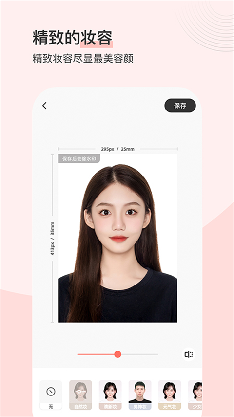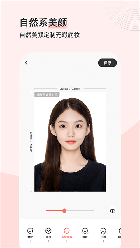 AI智能研究算法提供磨皮、美白、五官立体、瘦脸、小脸、发际线、法令纹、黑眼圈、亮眼等美颜功能。更有适合懒人、手残党的一键式化妆,人像识别满足你对自然妆、清新妆、元气妆、男神妆、女神妆的需求,支持自定义妆容程度。一键还原最美且真实的你,打造完美、自然、高级感脸庞,告别证照不美时代。