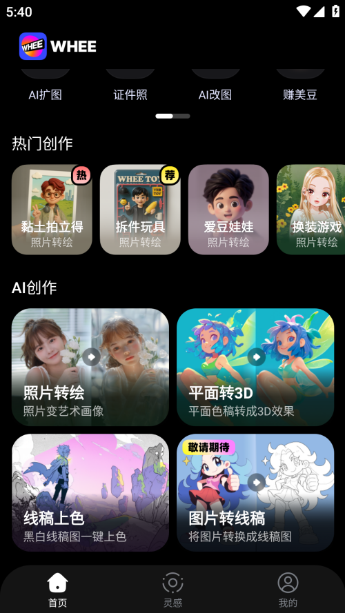 v3.1.1美图whee是一款美图秀秀旗下打造的AI图片创作工具,用户可以通过关键词来生成各种AI图片,也可以用于生成视频,你还可以使用这款app来将你拍摄的图片或者视频进行卡通化,这里还有很多抠图、修图、滤镜等功能,也可以为你提供很多创作的灵感,不论是工作还是兴趣爱好都是不错的选择!