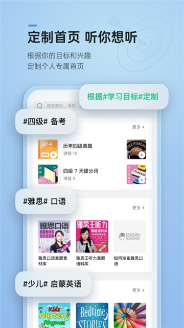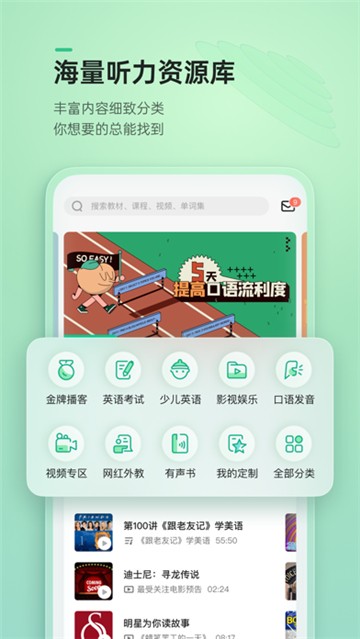 四六级考研、雅思托福、口笔译……国内外考试的听力真题和备考资料及时更新;正版引入《雅思王听力真题语料库》《韩刚:90天攻克三级笔译》等一众王牌教材。