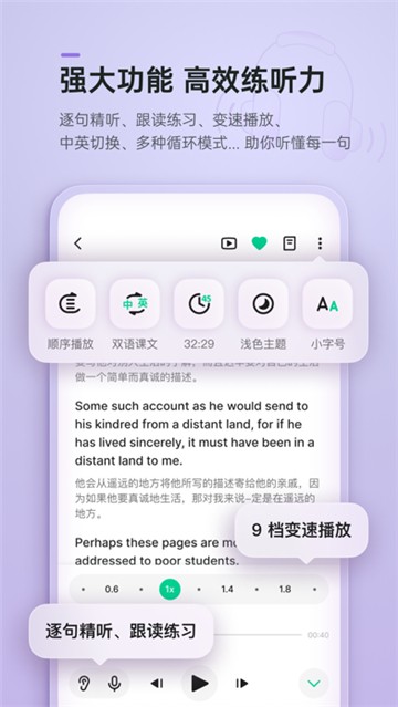 1、线控跟读功能可实时对比发音,帮助修正语调语气,提升口语表达准确性。
