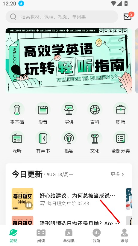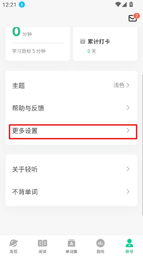 1、进入《轻听英语》APP 首页后,点击右下角账号选项。