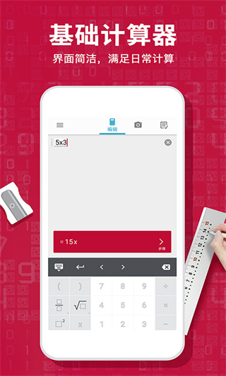 3、在photomath的计算键盘中可以看到,该APP能够实现的多种运算。