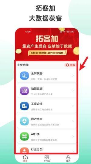 1、主界面功能丰富,包含全网搜客、地图数据、工商信息、AI扫楼等智能拓客工具,可快速搜索并提取企业数据。
