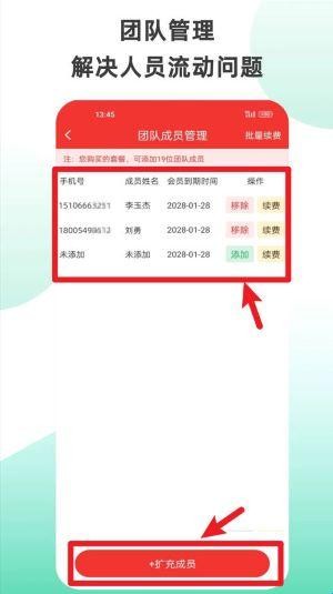 4、团队管理模块支持批量添加与移除成员,并标注会员期限,管理权限清晰明确。