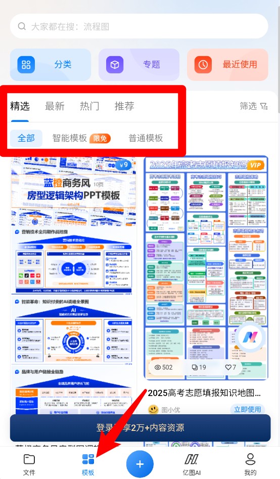 1、模板页面可浏览精选、热门等分类内容,并筛选智能或普通模板,查找更高效。