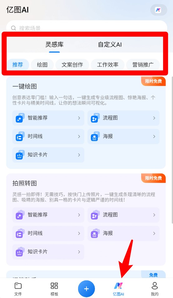 4、“亿图AI”模块提供灵感库与一键绘图服务,适用于文档制作、流程梳理等多场景。