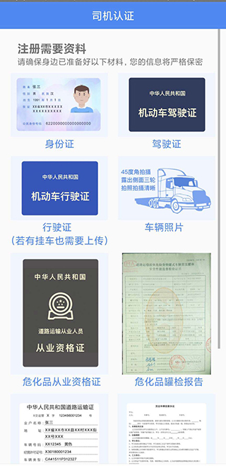 4、下一步,需要司机认证,需要准备以下材料:身份证、驾驶证、行驶证、车辆照片、危化品从业资格证、危化品罐检报告、道路运输证、车辆使用权协议;
