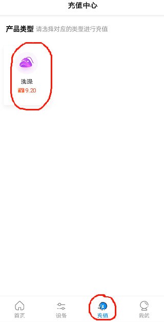 1、注册完成后,打开app,登录账号,点击“充值”,再点击“洗澡”,进行充值,最低充值金额为10元。