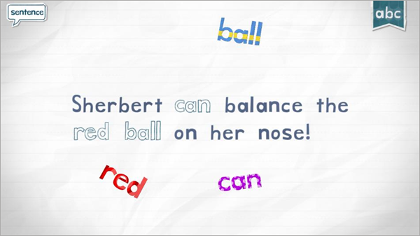 5、接下来, 各种萌系小怪物蜂拥而至,搬着刚刚拼好的单词跟含有这个单词的句子,让你的孩子跟你一起用填空的形式来完成。