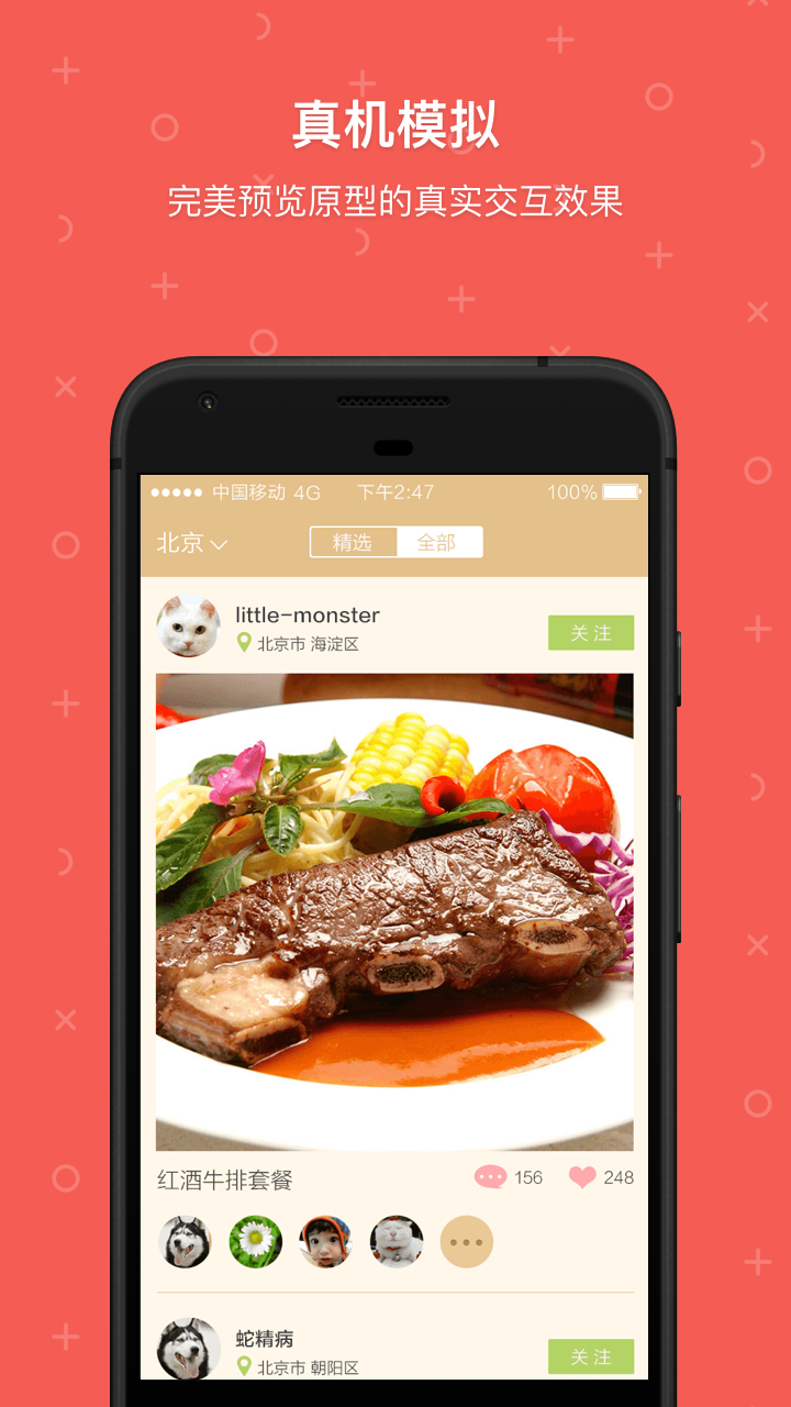 只需1步,快速添加页面交互,提供5种设备类型、24款真机外壳,手机直接演示产品交互,所见即所得。