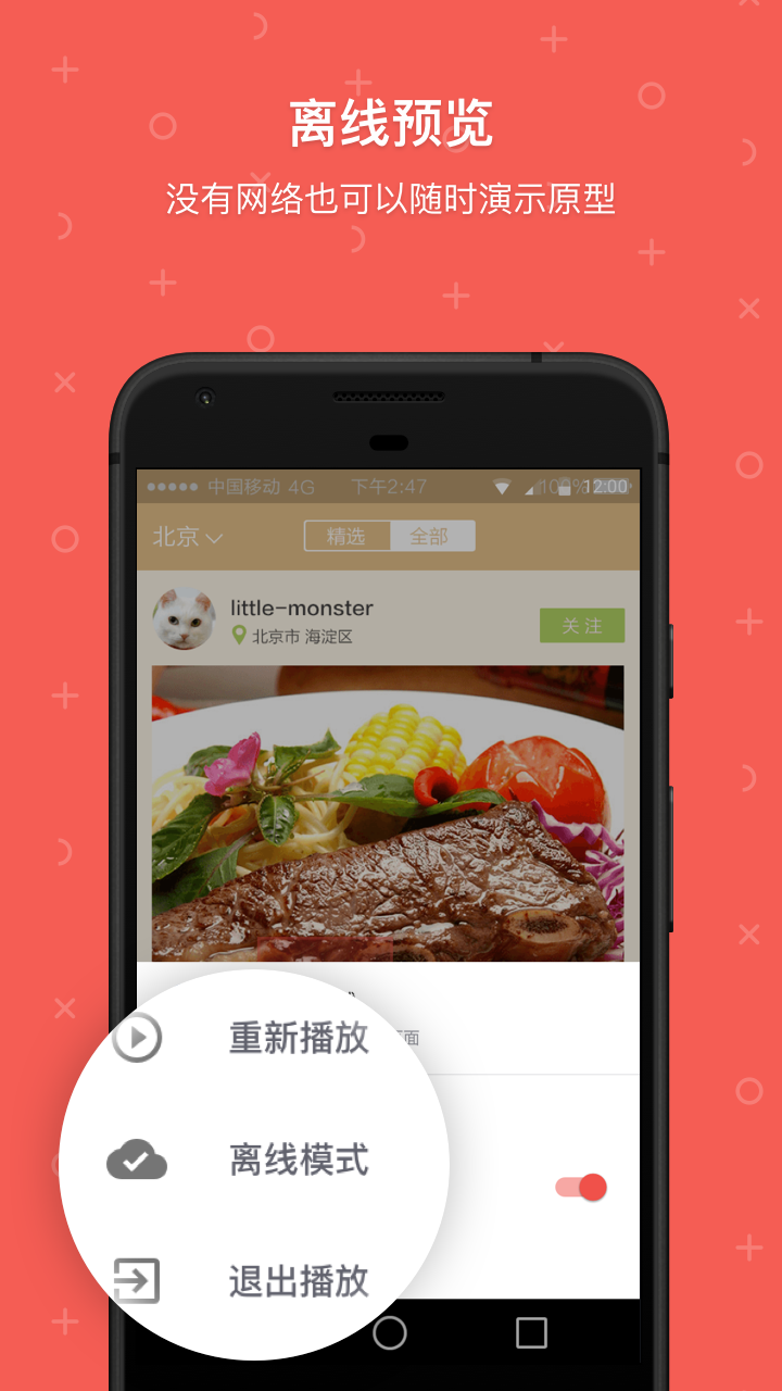 2、原型预览助手支持应用原型的离线演示。进入预览页面,长按操作切换离线模式。没有网络也可以轻松演示原型;
