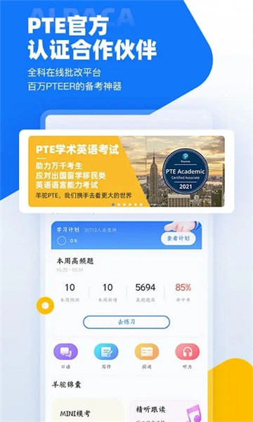 羊驼PTE是一款非常专业的PTE英语学术考试软件,大家能够在这里进行专业的备考,给你分享了非常多的备考知识,每天都能够在这款软件中练习题目,不断的提高大家的做题效率,整个软件上面有很多的专业老师,可以帮助大家进行指导,使用这款软件进行影子跟读,提升了大家的口语和听力能力。