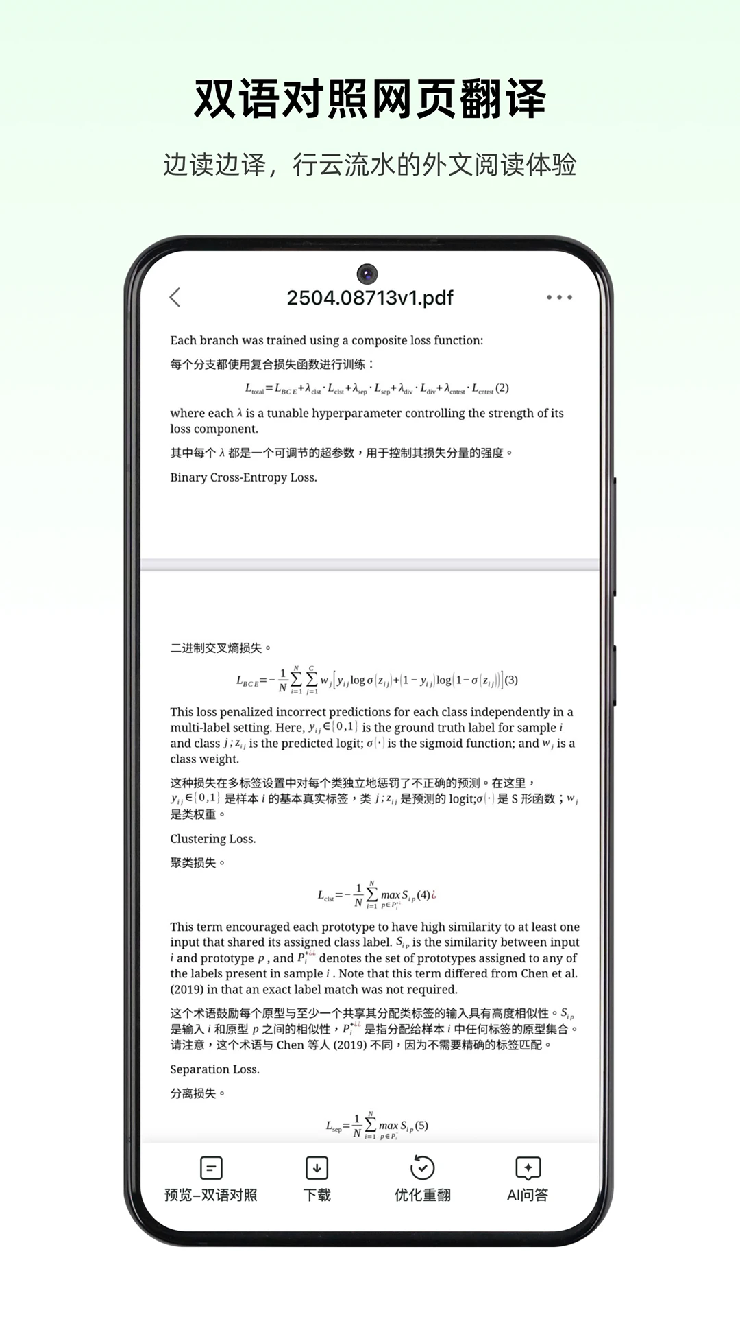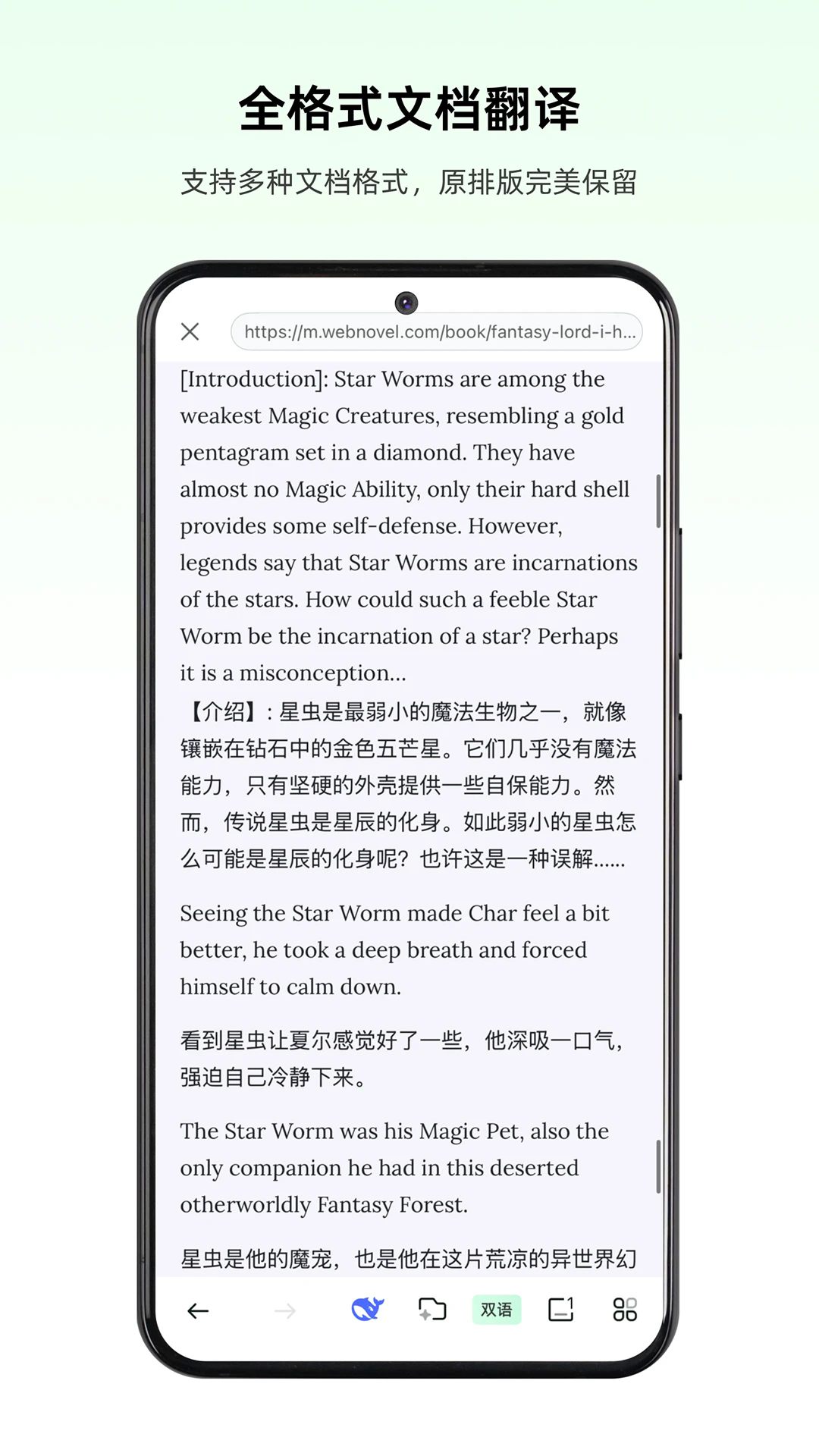 点击首页右下角的“文档”按钮,上传手机中的你所需要翻译的文档(PDF / docx / doc / PPT / xls 任一格式),选定语种,即可获得双语对照的翻译结果!使用同一账号登录,在电脑和手机上均可浏览和下载