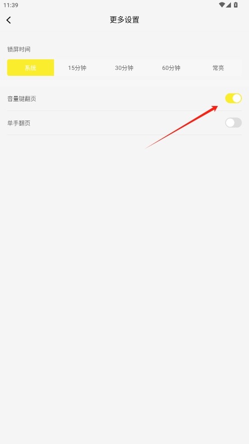 滑动至菜单底部找到"更多设置"入口,该区域包含多项高级阅读偏好设定。在翻页控制分类下,可见带有开关标识的"音量键翻页"选项。