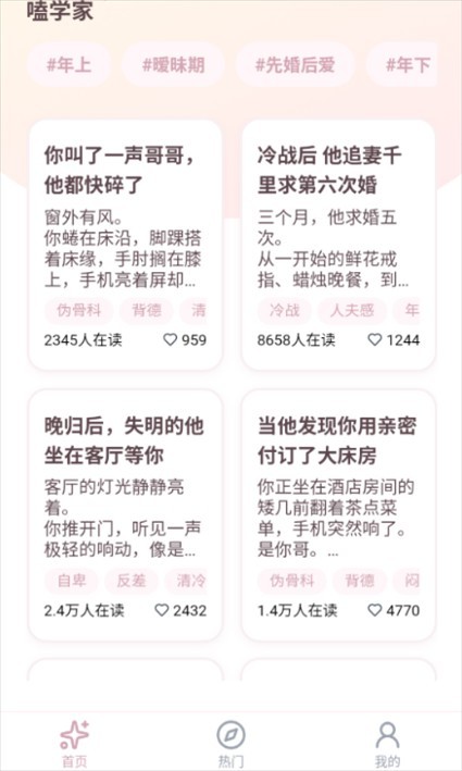 2、用户们可以在首页根据标签筛选出自己喜欢的小说,有暧昧期,先婚后爱等。