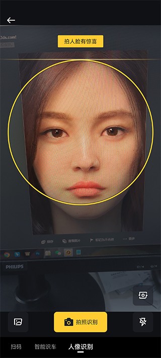 3、这时将人脸放进黄色的方框中,点击【圆点】拍照,等待几秒结果就出现啦。