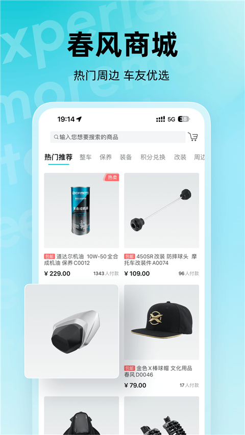 商城:提供整车、改装件、骑行装备、保养品、周边及积分兑换商品;