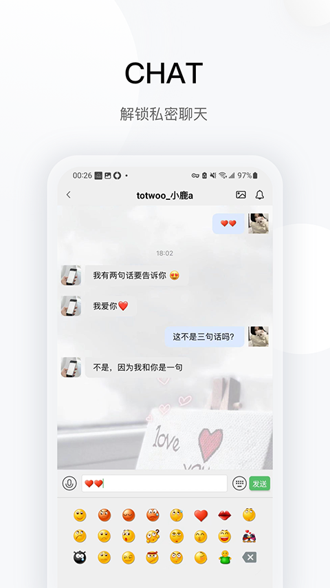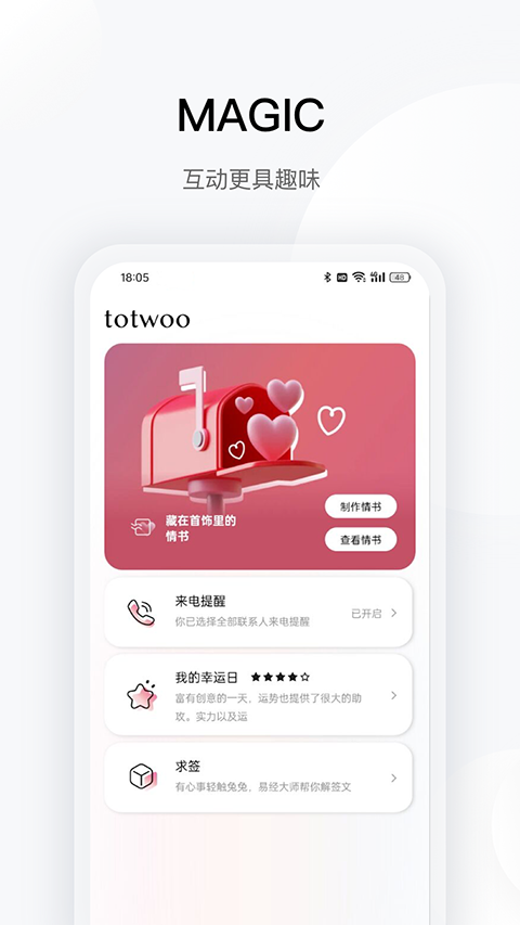 v4.0.3e378524.62totwoo是专为totwoo情侣手链推出的一款设备管理工具,用户只需将设备与手机进行连接,即可通过软件查看情侣专属空间,超多趣味功能等你你的探索。而且软件还为用户提供了活跃的社区交流功能,用户可以在这里查看设备相关的最新资讯、与其他用户交流分享自己的设备使用体验等,为用户带来一站式的设备先关服务。
