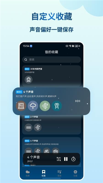 2、在收藏页面,为我们展示了多元化的白噪音素材,一键播放。