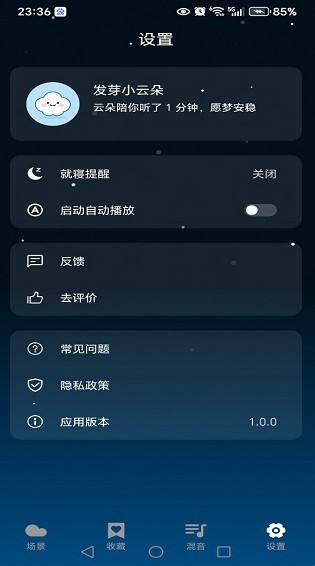 v1.0.0云朵睡眠是一款专为放松身心、提升专注力和改善睡眠质量设计的白噪音应用。无论是帮助你入睡,还是在嘈杂环境中提升专注力,云朵睡眠都能为你提供极致的听觉体验,让你感受前所未有的平静与放松。无论是帮助你入睡,还是在嘈杂环境中提升专注力,云朵睡眠都能为你提供极致的听觉体验,让你感受前所未有的平静与放松。·有需要的用户欢迎下载体验。