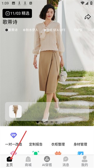 2、主页板块,展示歌蒂诗、秋水伊人等品牌穿搭案例,提供一对一改造、定制报告等服务入口,呈现时尚穿搭风格。