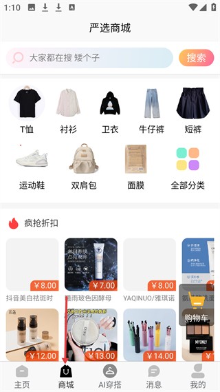 3、商城板块,名为严选商城,分类有T恤、衬衫等服饰及运动鞋、双肩包等配饰,开展疯抢折扣活动,展示多款优惠商品。