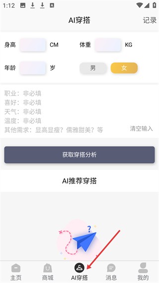 4、IA穿搭板块,可输入身高、体重、年龄等信息,选择性别,还可填写职业、喜好等非必填项,获取穿搭分析和AI推荐穿搭服务。