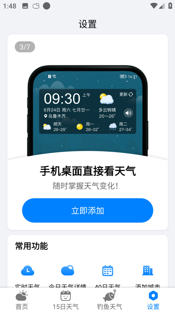 1、桌面小组件:支持双城天气查询,不同大小的桌面天气主题风格。