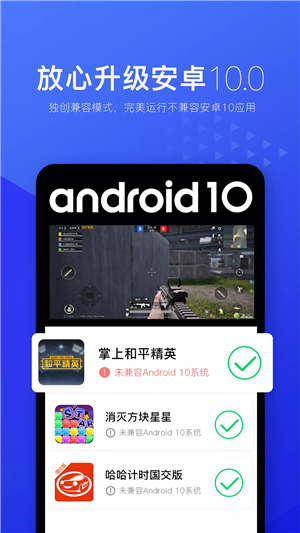 1、运行不兼容安卓10的应用。在安卓10手机上运行掌上和平精英、同事APP、单机游戏等。