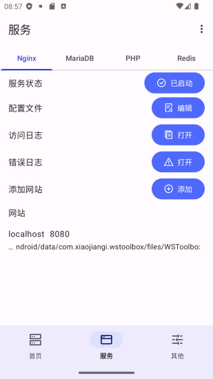 WSToolbox是一款可以让安卓设备变成服务器的应用程序。它支持多种服务,包括Nginx、PHP、MariaDB、Redis等,用户可以利用它搭建 Web 服务器,托管静态网站或运行动态网站和Web应用。