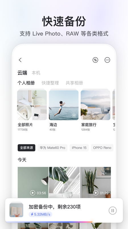 阿里云盘网页版是一款非常好用的网盘储存工具,这样日常工作学习都是更加的方便,并且采用了三层加密,各大平台社区还会发放200GB~1TB不等的“扩容码”,【照片备份】“手机照片弄丢了?”——手机里照片、视频快速备份到网盘,对于不少用户们说真的是很实用的,感兴趣的朋友快来下载体验吧!