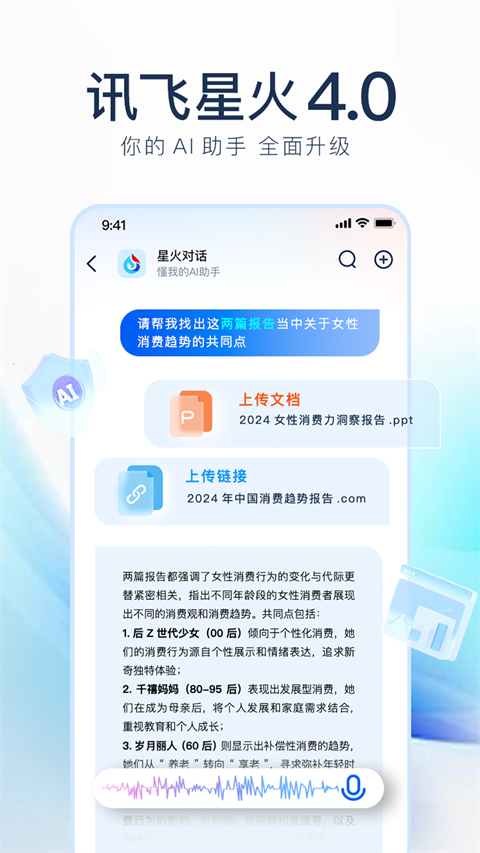 v4.0.58科大讯飞星火app是一款科大讯飞研发的智能大数据平台,这里拥有最全面最丰富的跨领域知识和资源内容,软件能够理解人们的问题,并且给出你答案为你执行各种任务,科大讯飞星火app用户可以通过打字来交流,也可以使用语音交流,便捷好用,快来加入体验一下吧。