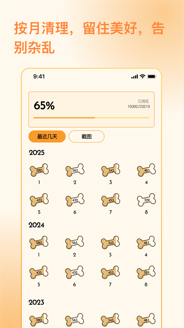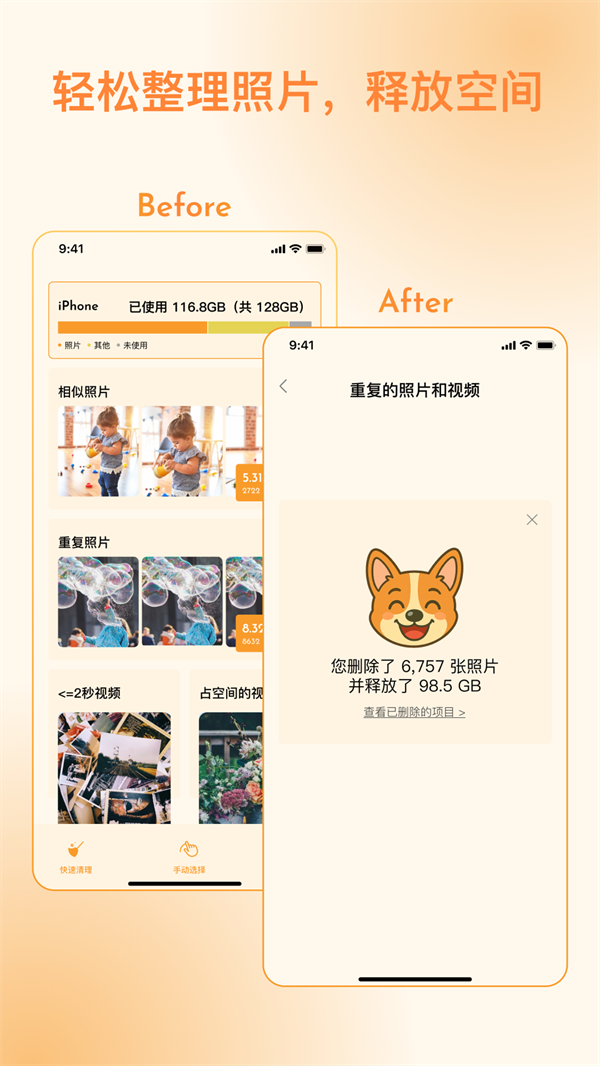 3、趣味柯基狗狗伙伴,让清理相册不再是一件枯燥的事。我们采用可爱狗狗主题设计,让整个过程轻松愉快。像玩游戏一样清理照片,帮助你养成定期整理的好习惯。
