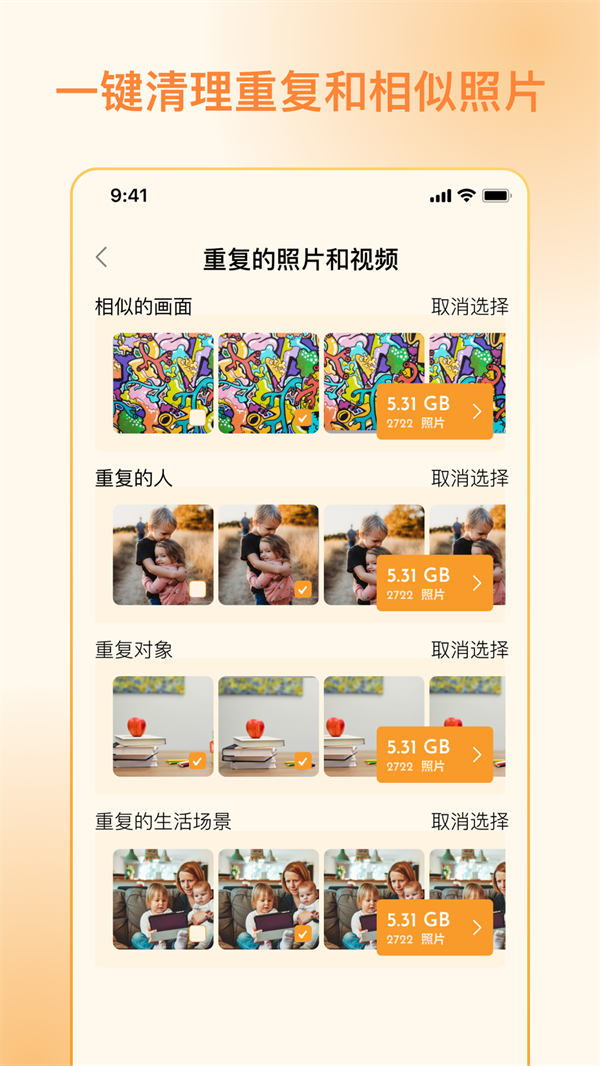 1、智能检测相似和重复照片,一键清理。照片狗可以自动识别并建议删除以下内容:重复或相似照片、模糊照片、大型视频文件、无用的短视频。无需猜测,一键查看并删除。