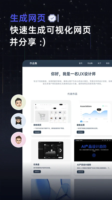 5、生成网页一键分享:输入需求生成个性化网页,添加元素后一键分享。