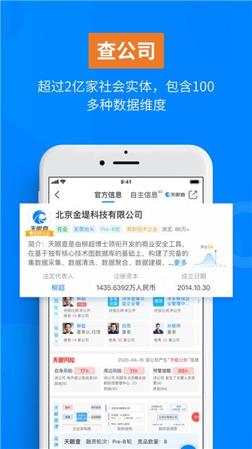 天眼查是一款十分实用的企业查询软件,用户可以通过软件了解到各个公司的信息,详细的内容助你更加深入了解公司,还有各个组织架构为你提供,真实有效的数据,为你揭开各个公司不为人知的一面,有需求的用户快下载体验吧。