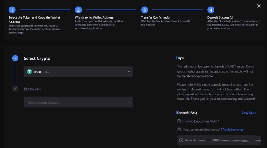 如果您希望存入加密货币,请转到“钱包”部分并选择“存款”。选择您要存入的加密货币(例如,比特币或以太坊)。MEXC 将为您提供该特定加密货币的唯一钱包地址。小心复制此地址 – 任何错误都可能导致资金损失。现在,将资金从外部钱包发送到此地址。