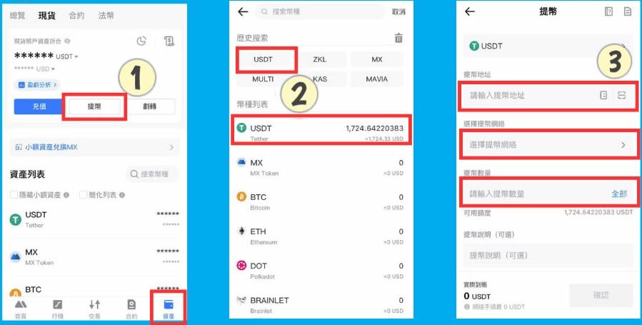 想把钱转到MEXC 以外的地方,无论是其他加密货币交易所或是链上钱包,都是使用链上提币的功能,步骤如下: