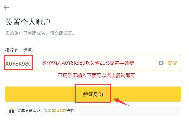 如通过好友邀请注册币安,请确保填写推荐人ID(选填)。