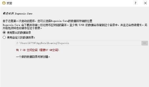 第一次安装Dogecoin钱包,需要下载一份比特币区块链的副本,至少有57GB的数据会存储在这个目录中,并且还会持续增长。