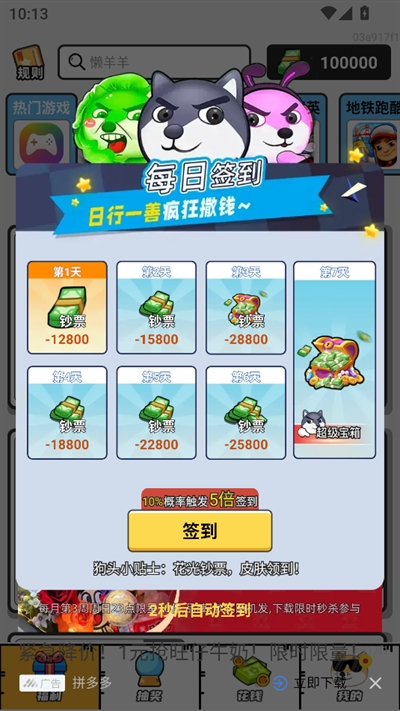 2、进入之后签到可以获得钞票