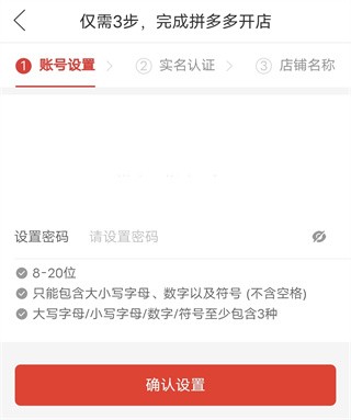 4、然后再完成三步操作即可完成拼多多开店,此时可以先设置密码点击“去设置”。弹出在修改密码界面,要根据他的提示修改密码,数字,字母,大小写,长度,设置完成之后,点击“确认修改”,修改成功会提示“修改成功”。